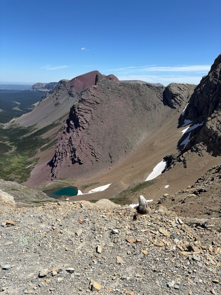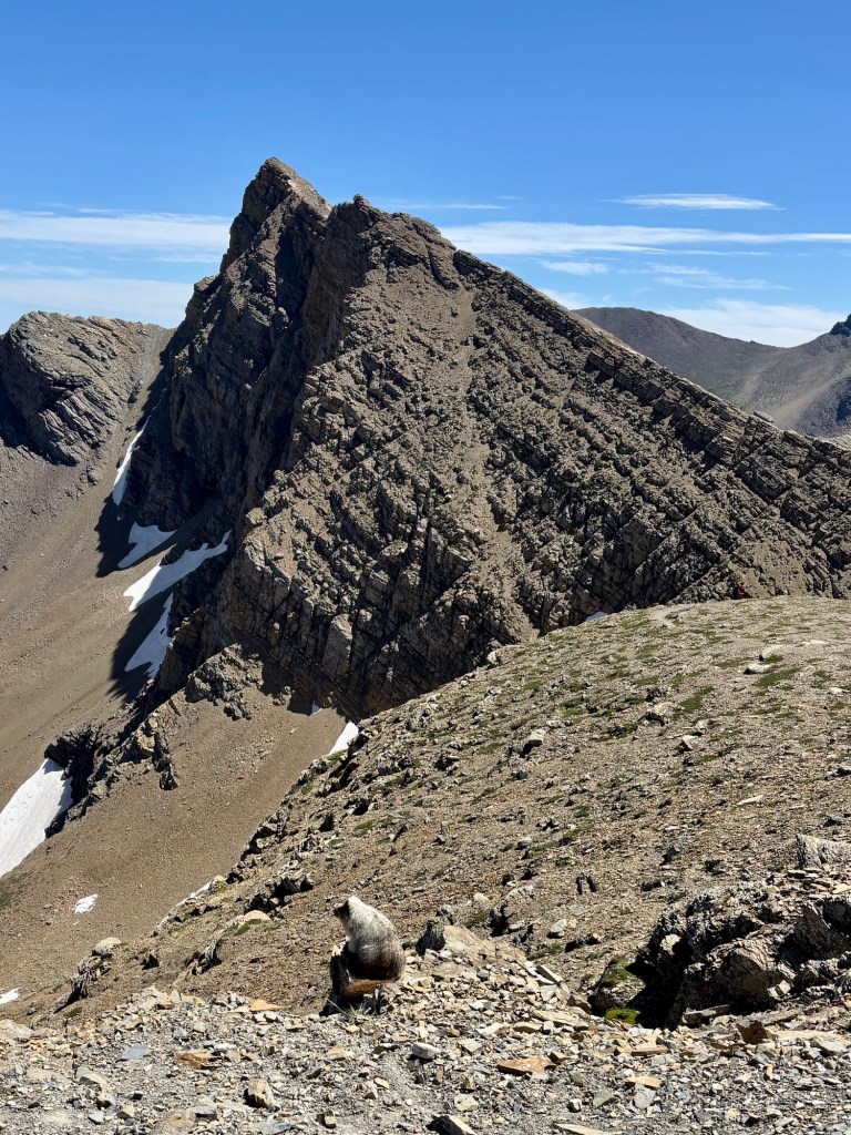 At the summit, as I rounded the corner to traverse to the other side, I was surprised by two hoary marmots looking for their own lunch! Warm with their thick winter coats still on, the cautiously checked me out and decided I was ok but they’d keep their distance. They let me admire them for a bit before disappearing into the rock crevasses. Thank you hoary marmots!