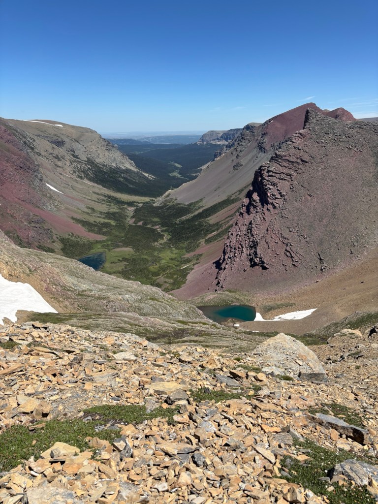 The other side of the pass opened up to more spectacular mountain views and a lake far, far below. I took in the view quickly and then turned around, both because my parents were waiting and I needed to find a spot to pee! I hustled down the switchbacks, as much as I could hustle. Between the loose rock and “take your breath away” strong winds, it was quite the adventure. I couldn’t help but laugh, scream for joy a bit, and marvel at the amazing privilege of being alive in those moments. The views were just unbelievable.